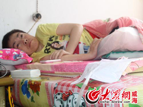 据丈夫孙庆秀介绍,马玉玲全身的肌肉正逐渐萎缩,双腿已无法正常伸直,常年保持蜷缩姿势,右手基本丧失活动能力,左手可以用来按键接听电话。问及导致瘫痪的原因,马玉玲解释,最初去医院检查是腰椎间盘突出,后来颈椎又出现问题,肺功能也不行,马玉玲说太专业的医学术语她理解不了,但记得一句“颈椎压迫神经引发瘫痪。”“花了上万元还是没把病治好,半个月就要换次导尿管,一个月是两百,还要吃药,最便宜的……”话未说完,她已哽咽难语。马玉玲称在年轻时做过两此手术,手术两年后开始无法正常行走,慢慢的,腰部以下失去知觉,大小便失禁,需要插导尿管,这一躺便是8年。日常起居需丈夫和婆婆轮流照应,而家中的经济来源靠丈夫打临工及低保维系,微薄的收入难以维持医疗费用,加上残疾人补助,每年可以领3000元,但仍是杯水车薪。