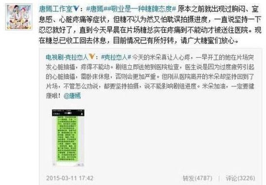 3月11日17点42分,电视剧《克拉恋人》官方微博称:“今天的米朵真让人心疼,一早开工的她在片场突发心脏抽搐,疼得不能动。剧组立即送她到医院检查,医生说是因为过度疲劳引起的心脏抽搐,需卧床休息,否则会更加严重。但刚从医院离开的米朵却坚持回到了片场,不管怎么劝说,都要坚持拍摄,说不能影响剧组进度。米朵加油,一定要健康哦!”并艾特唐嫣。