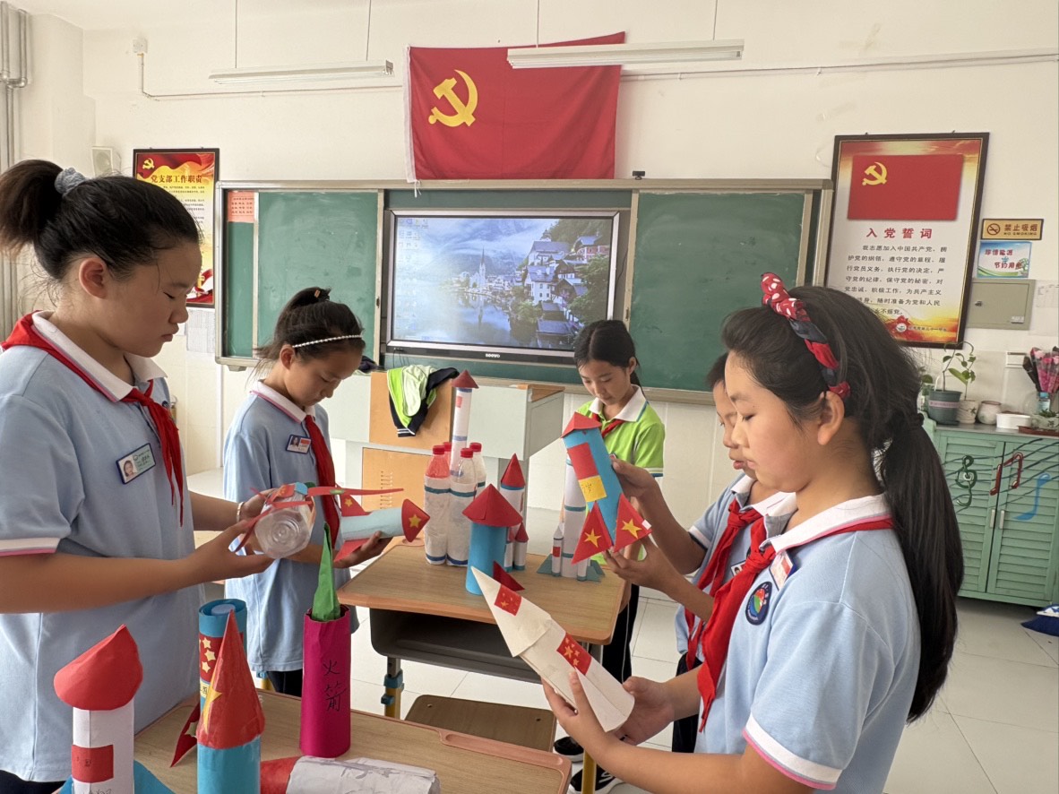 此外,科技手工制作、科技想象画、变废为宝三大静态展区成果丰硕。学生们用卡纸、废旧零件制作出“液压升降桥”“简易发动机”等手工作品;科技想象画中,“太空移民基地”“星际穿梭机”等奇思妙想充满未来感;“变废为宝”手抄报则以图文结合的形式,分享了利用废旧材料制作航天模型的方法,将环保理念与科技创意巧妙融合。
