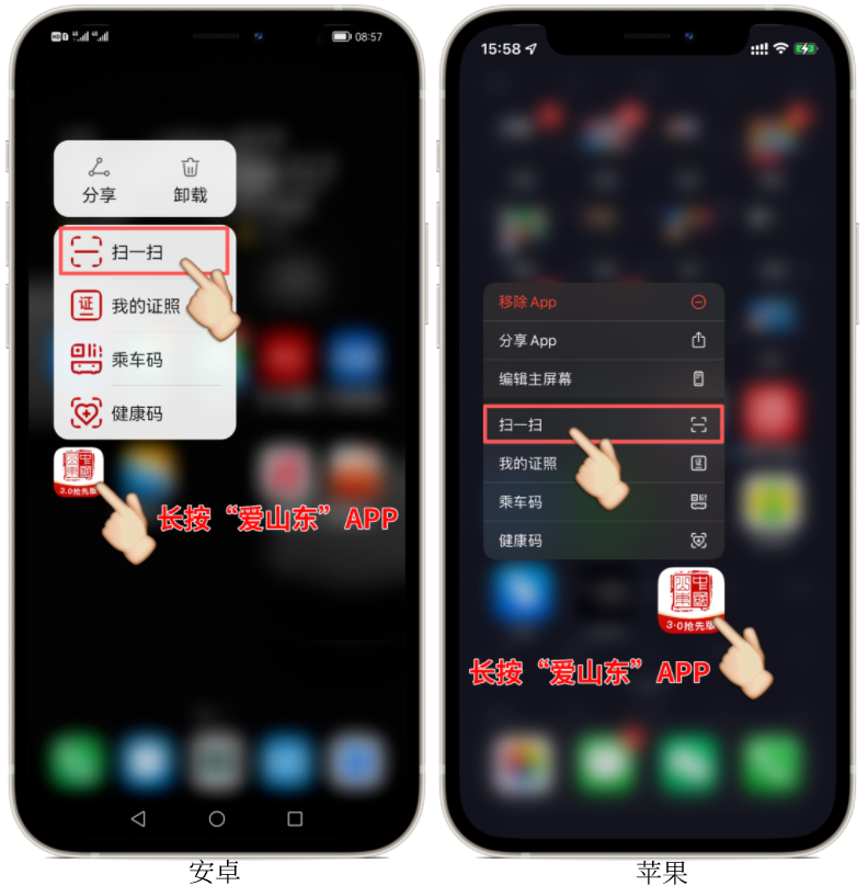 在手机桌面长按“爱山东”APP图标,在快捷方式弹窗中点击“扫一扫”即可快速打开该功能。