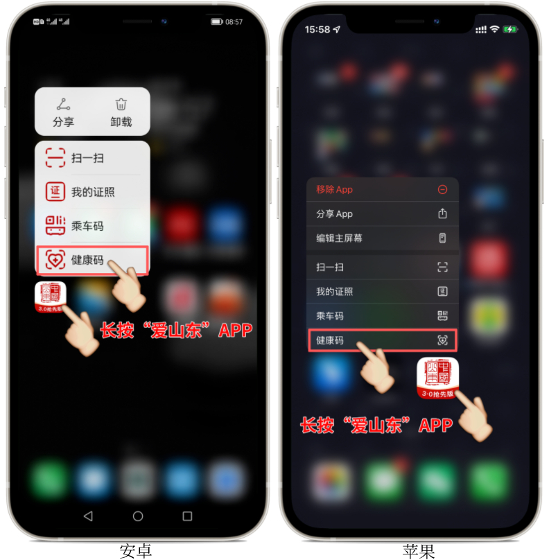 在手机桌面长按“爱山东”APP图标,在快捷方式弹窗中点击“健康码”即可一键打开健康码。