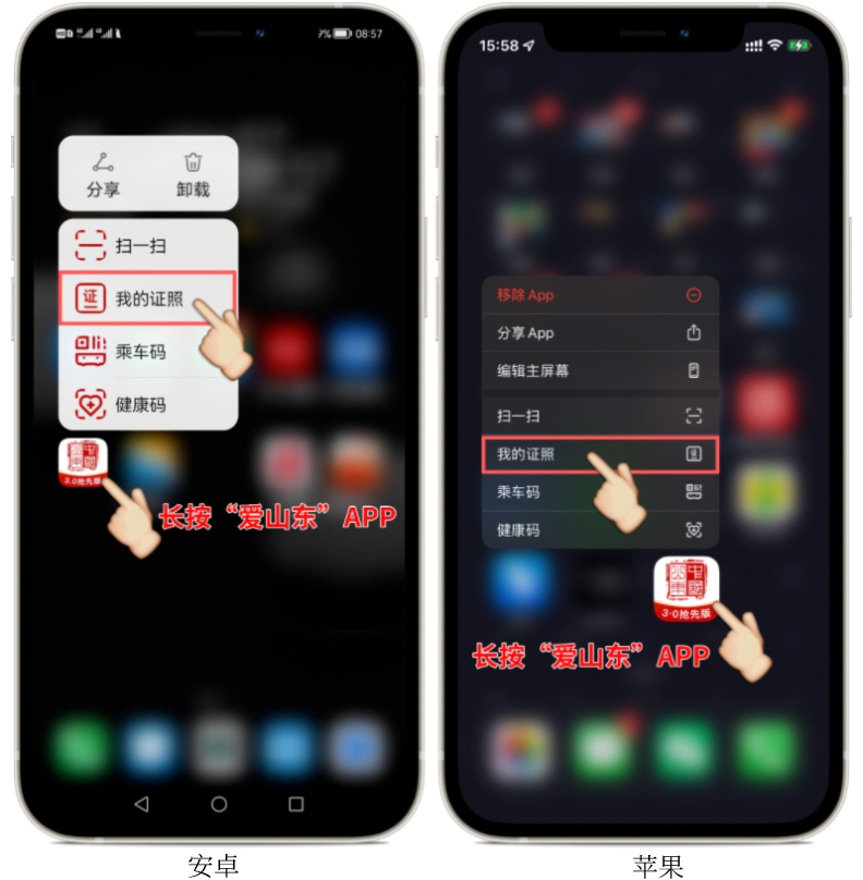 在手机桌面长按“爱山东”APP图标,在快捷方式弹窗中点击“我的证照”即可快速打开电子证照功能。