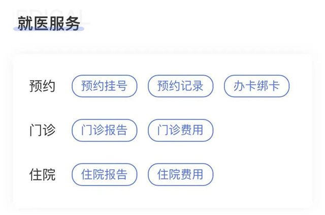 就医服务版块中,包含了预约挂号、预约记录查询、办卡绑卡服务(健康卡)、门诊及住院报告、费用查询等常用服务。