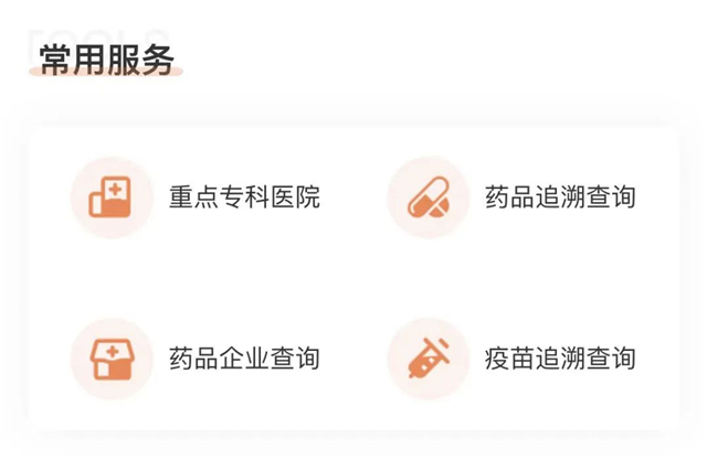 常用服务版块中,包含了重点专科医院、药品/疫苗追溯、药企查询等服务。