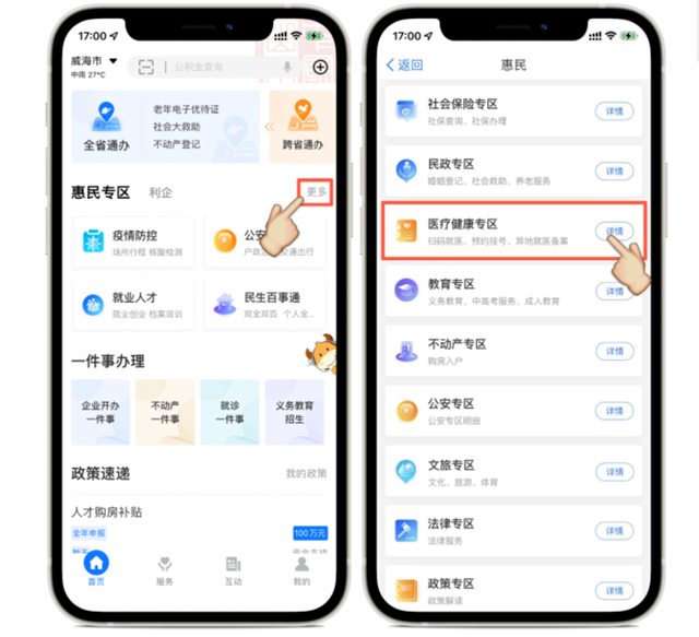 2、在惠民专区点击【更多】按钮,选择进入“医疗健康专区”,专区内包含新冠疫情防控专区、就医服务、妇幼健康、常用服务和政策查询等多项服务。