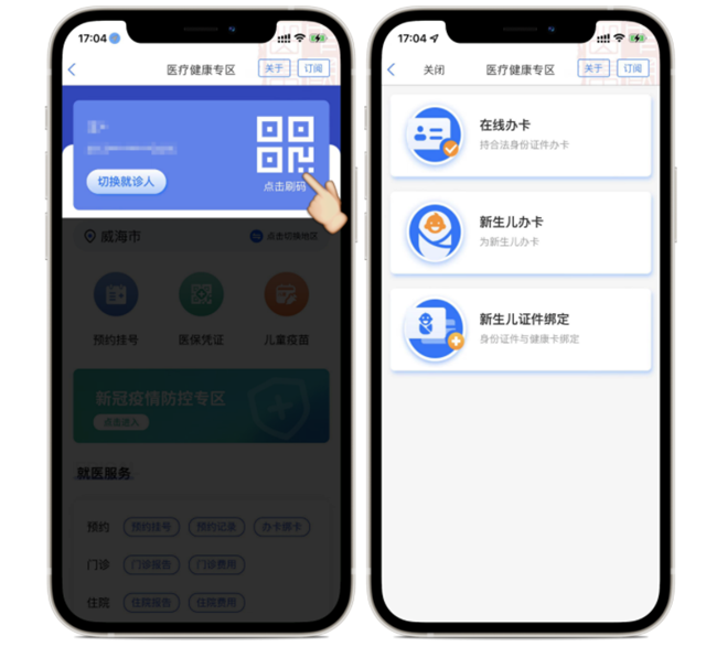 在专区内,可快捷出示就诊健康卡,并支持为他人及新生儿线上办理健康卡,实现全流程无卡就医,解决忘记带卡、丢卡和多卡的难题。