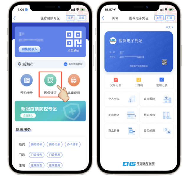进入“医保凭证”服务,可快速出示医保电子凭证二维码,在支持医保消费的医院、机构直接扫码消费时使用,还可查看交易、使用记录、定点医院、定点药店等信息。
