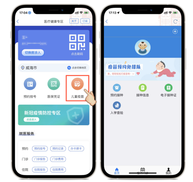 进入“儿童疫苗”服务,可在线绑定儿童信息后预约疫苗接种,查询接种信息、电子接种证等,还可便捷查询各区市接种门诊。