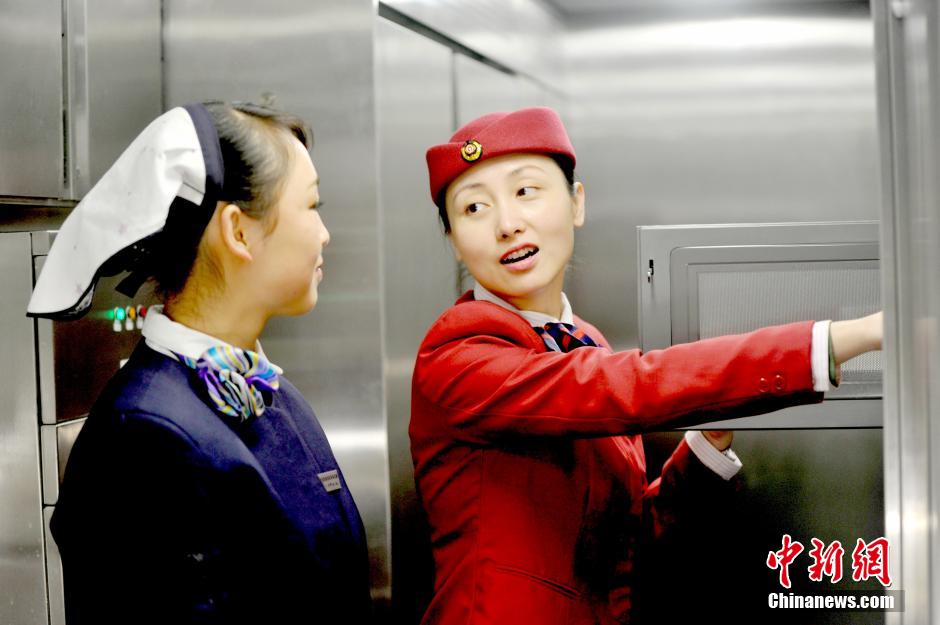 2014年春运即将来临,近日,记者跟随南昌铁路局南昌客运段一对名为“艳佳”组合的两位动车长一起出乘,记录美丽“动姐”们值乘的一天。据介绍,“艳佳”组合中的徐艳、熊佳两位车长,因其以“情满旅途,‘艳’丽人生;待客如亲,温暖如‘佳’”的独特服务法,受到旅客的好评与赞誉。图为徐艳在对餐车情况进行检查。鲍赣生摄