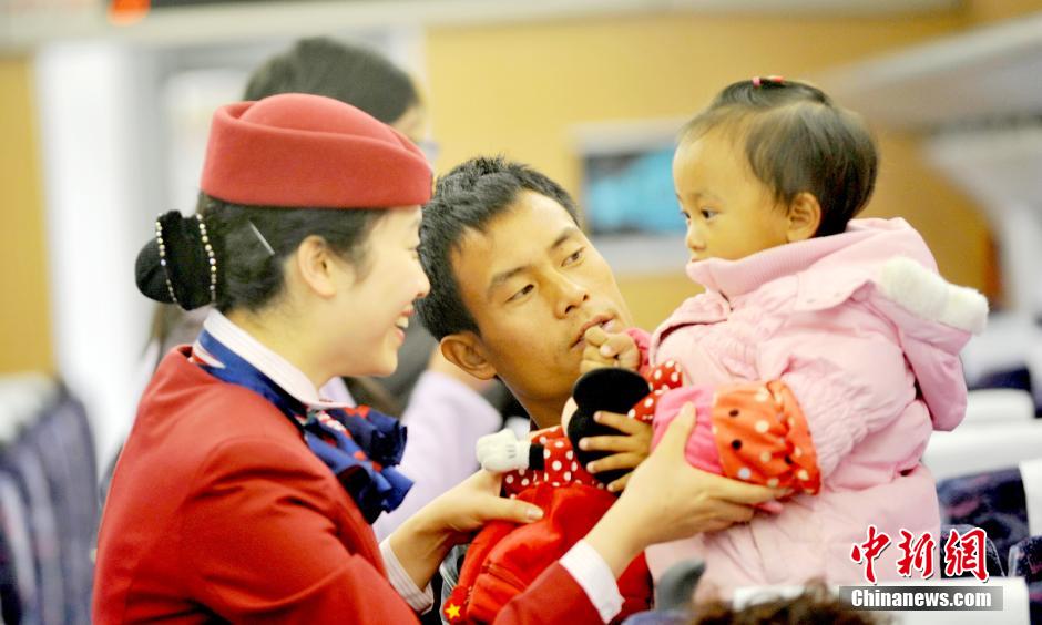 2014年春运即将来临,近日,记者跟随南昌铁路局南昌客运段一对名为“艳佳”组合的两位动车长一起出乘,记录美丽“动姐”们值乘的一天。据介绍,“艳佳”组合中的徐艳、熊佳两位车长,因其以“情满旅途,‘艳’丽人生;待客如亲,温暖如‘佳’”的独特服务法,受到旅客的好评与赞誉。图为列车长熊佳为小旅客服务。鲍赣生摄