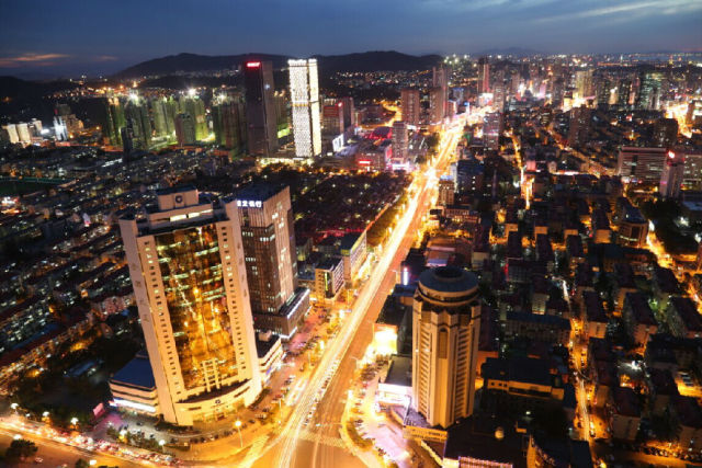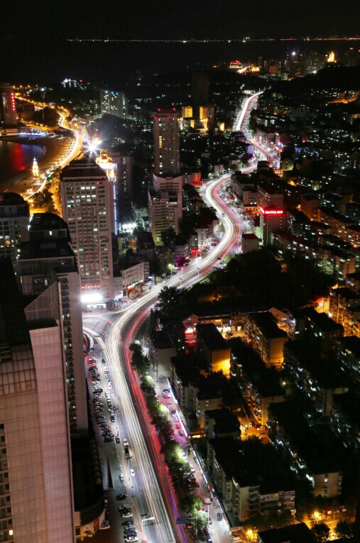 入夜后的烟台,金色的路面映照灿若晨星的万家灯火,美不胜收。